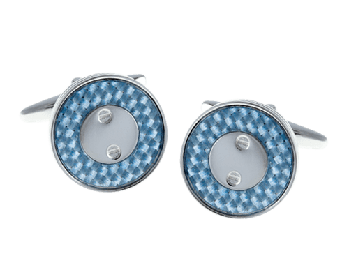 A round metal plate screwed in to a sky blue carbon fibre insert, give these cufflinks an industrial feel.